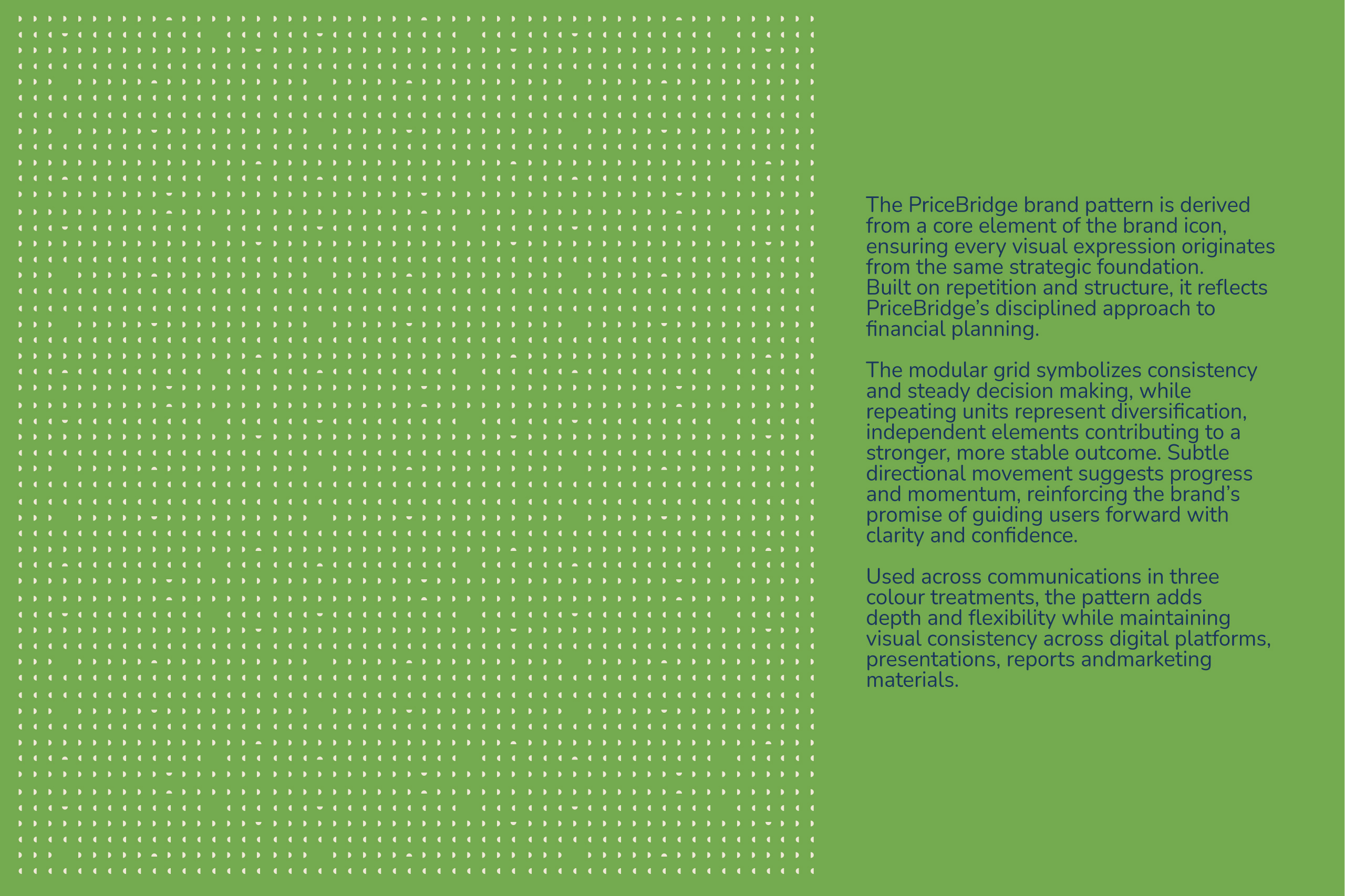 We translated PriceBridge’s approach to financial intelligence into a clear, cohesive visual system, one that feels structured, dependable and future-ready. Built on clarity, consistency and data-led planning, the identity uses shape and repetition to reflect diversification and long-term growth over short-term noise.